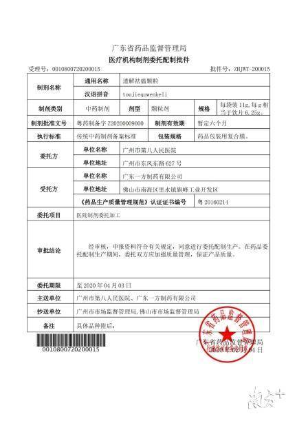 “‘肺炎一号方’是广州市第八人民医院的医生根据他们之前的防疫工作经验,并结合临床症状调配出来的方子,而药是使用了一方制药的颗粒。”魏梅说。据悉,一方制药在1月31日接到协助广州市第八人民医院申报医院制剂并负责配制的通知后,迅速组织技术、质量、生产及市场相关人员成立了联合攻关小组,按照医疗机构制剂申报相关要求,加紧开展“肺炎一号方”医疗机构制剂的研究和申报工作,经过3天3夜的奋战,完成了三批备案产品的生产和检验,向广东省药品监督管理局提交了所有研究资料,获得了制剂备案审批。