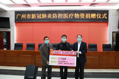 新型冠状病毒引起的肺炎疫情发生后,广汽集团国际业务本部积极通过外方合作伙伴、海外经销商筹措医疗防护物资。广汽集团向广州卫健委捐赠现金、汽车及防护用品一批约835万元。2020年2月4日下午,广州市卫健委举行“广州市新冠肺炎防控医疗物资捐赠仪式”,其中广汽集团通过广州市慈善会向市卫健委捐赠500万元现金、价值300万的20辆广汽传祺汽车以及2000件手术衣、1万个N95口罩等防护用品,总价值约835万元,将由卫健委统筹分配到各个医院。