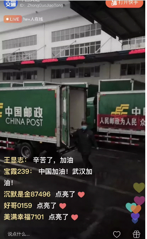 中国邮政官方微信、中国邮政报官方微信、交通运输部快手官方账号等多家平台同步发起直播。400万人在线观看,与其美多吉、肖文远一起驰援战“疫”一线云端隔屏为武汉加油!