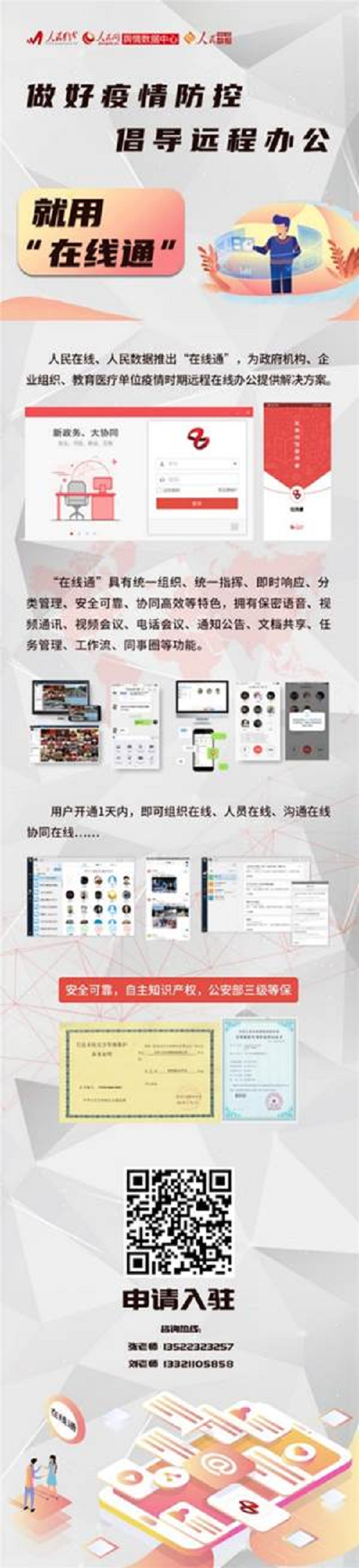 人民在线、人民数据推出“在线通”, 为政府机构、企业组织、教育医疗单位疫情时期远程在线办公提供解决方案。“在线通”具有统一-组织、统一指挥、即时响应、分类管理、安全可靠、协同高效等特色,拥有保密语音、视频通讯、视频会议、电话会议、通知公告、文档共享、任务管理、工作流、同事圈等功能。